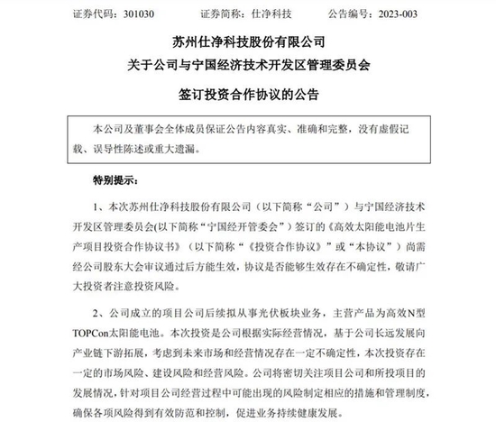 公告显示,宁国经开管委会承诺为仕净科技成立高规格的项目领导组,高位推进,顶格办理。在项目准入、规划选址、土地报批、工程施工、环评能评审批等方面实行全程一站式、并联式、保姆式服务,积极为项目建设提供便利,在仕净科技积极履行协议的情况下,确保项目在2023年11月顺利投产。
