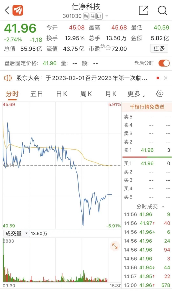 1月10日,仕净科技股价盘中跳水,一度跌逾5%。尾盘小幅回升,最终报收于41.96元,跌幅达2.74%,总市值55.95亿元。