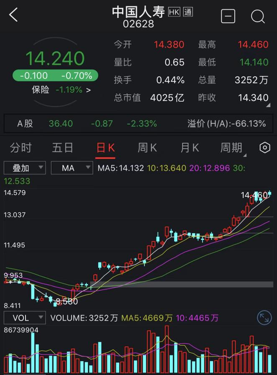 与此同时,与国内大多数金融股类似,国寿的H股较A股仍有明显折价。1月10日,其A股收盘价为36.40元人民币,H股收盘价为14.24港元。