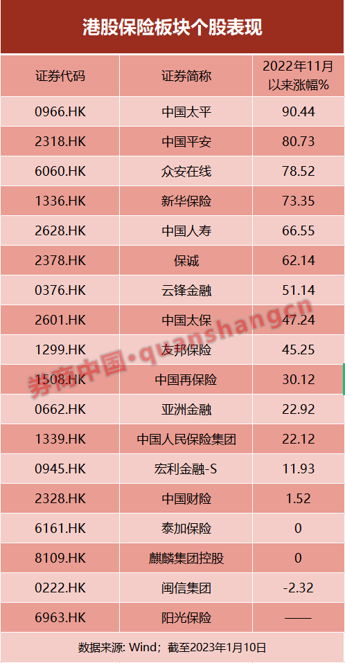 券商中国记者据Wind数据统计,在港股中,自2022年11月至今,中国太平上涨达90%,中国平安涨幅80%,众安在线上涨78%,新华保险上涨73%,中国人寿上涨66%,中国太保涨幅也达到47%。