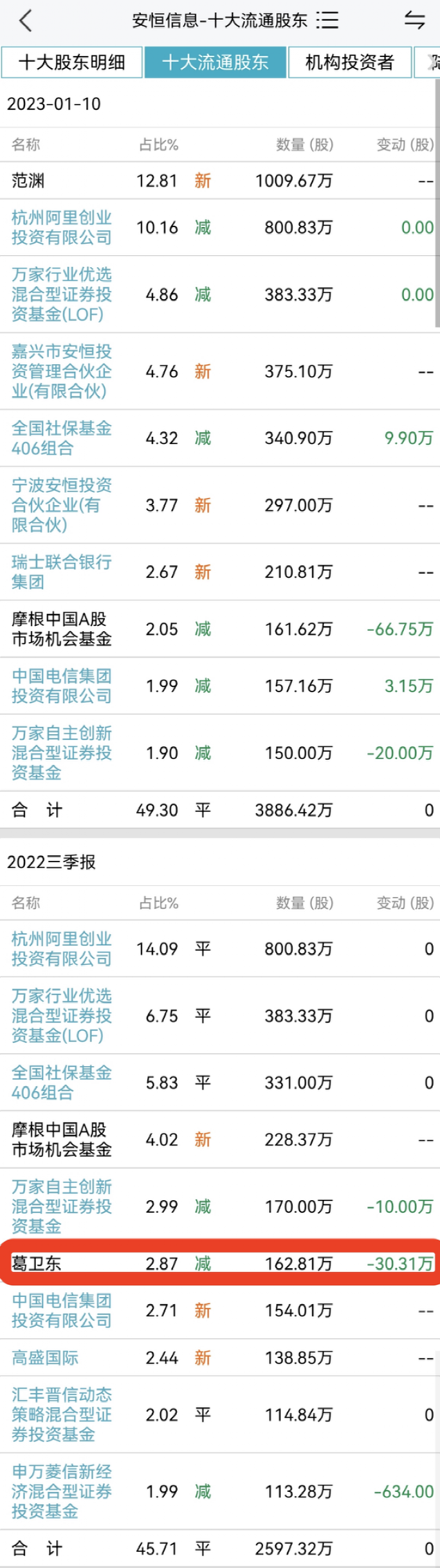 1月11日晚间,安恒信息发布回购股份事项前十大股东和前十大无限售条件股东持股信息显示,去年三季度末仍位列第6大流通股东大私募大佬葛卫东已经从前十大流通股东中消失。