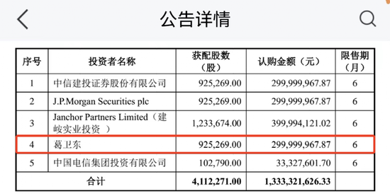 早在2021年10月21日,安恒信息定增结果出炉,包括葛卫东、中信建投证券、中国电信集团投资有限公司、外资机构中的J.P.Morgan Securities plc、Janchor Partners Limited(建峖实业投资 )在内的四家机构和个人成功获配。其中,葛卫东以324.23元的定增发行价获配92.53万股,认购金额接近3亿元。