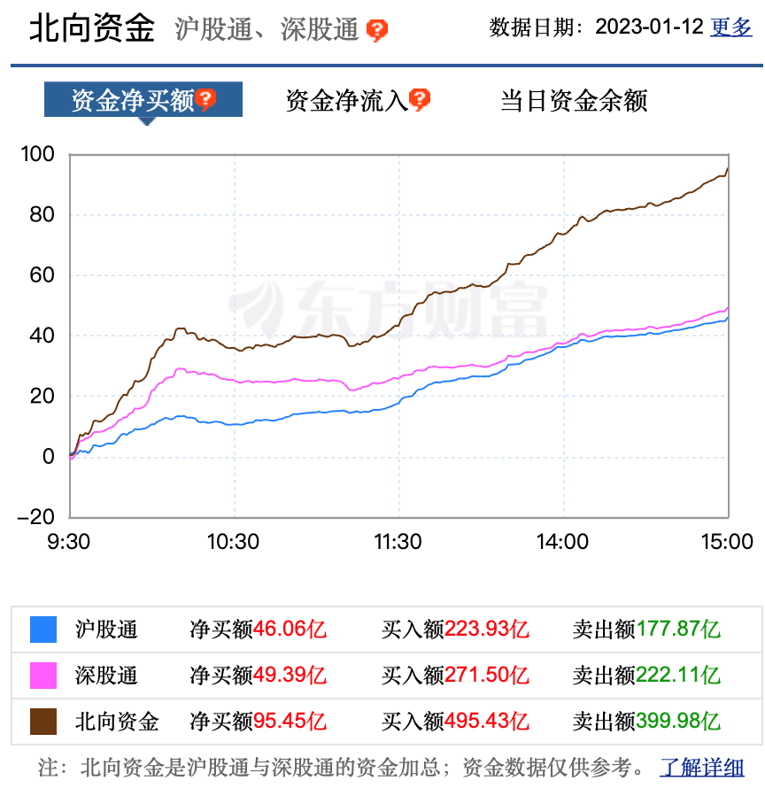 今天,尽管市场缩量明显,但北向资金不但没有收手的迹象,反而扫货更欢乐了。截至收盘,沪股通净买额46.06亿元,深股通净买额49.39亿元,合计净买额高达95.45亿元。