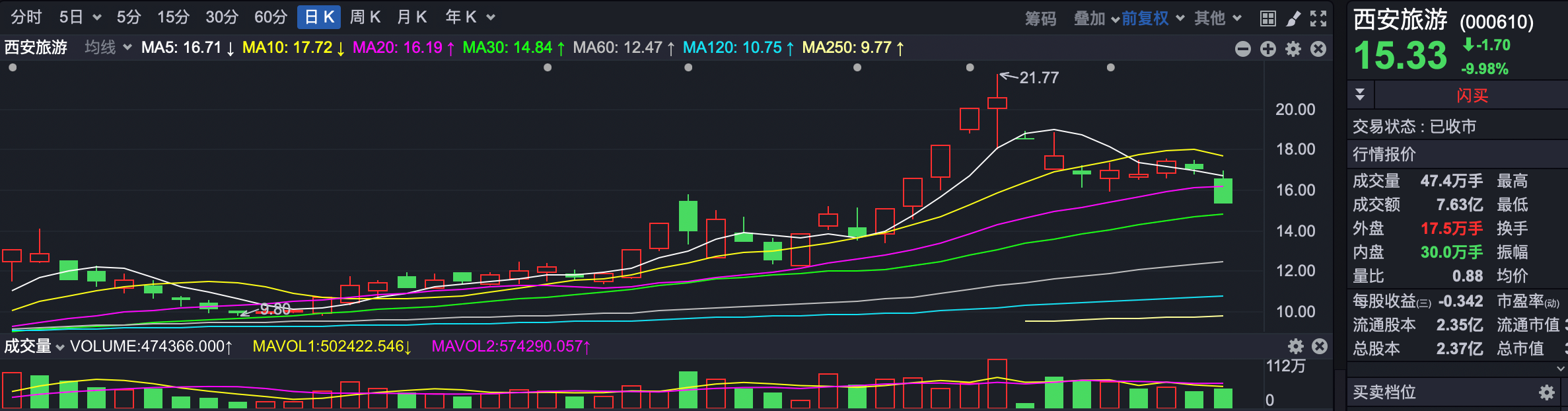 此外,今天还有一个市场现象值得关注。下午交易时段,不少前期热门股跳水,甚至跌停。比如全聚德、西安旅游、西安饮食都遭遇跌停。