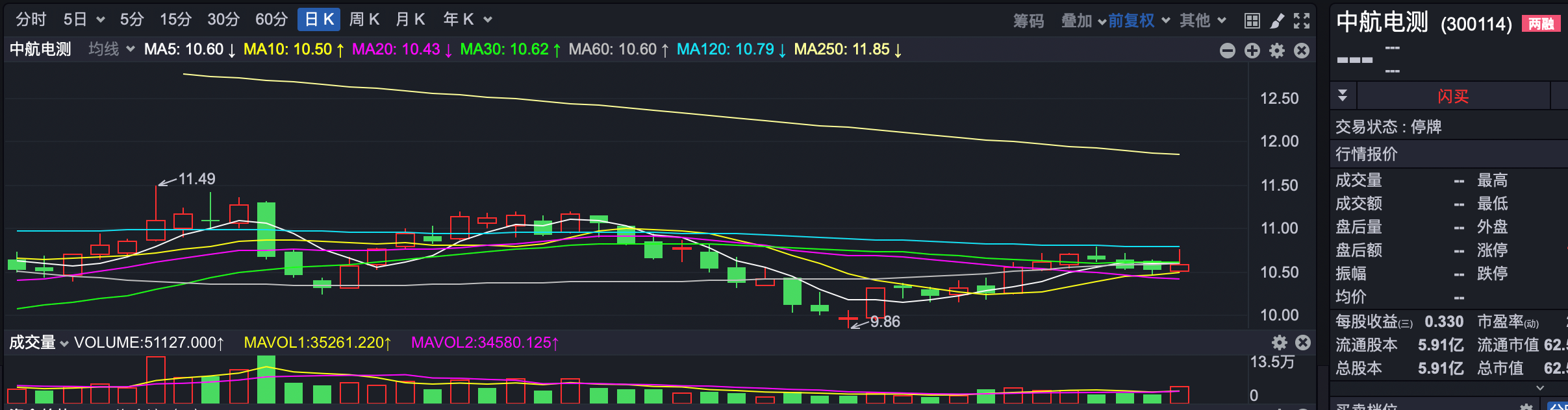 而现在,中航电测总市值只有60多个亿,如果复牌,那还不涨上天。昨天,中航电测停牌前最后一个交易日,盘中还是有所异动的,成交量也有所放大,不知道是否有内幕交易出现,这需要监管机构来查了。