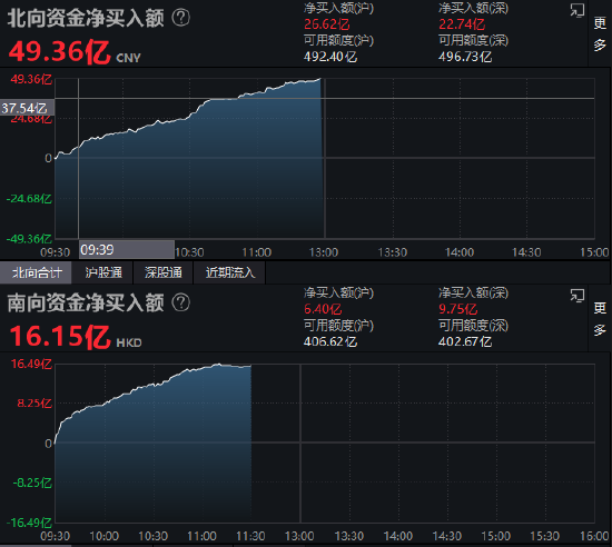 午评:北向资金净买入49.36亿元 沪股通净买入26.62亿元