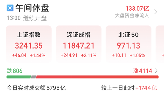 截至午间收盘,两市超4100股上涨,半日成交额5795亿元,北向资金半日净买入108.26亿元。