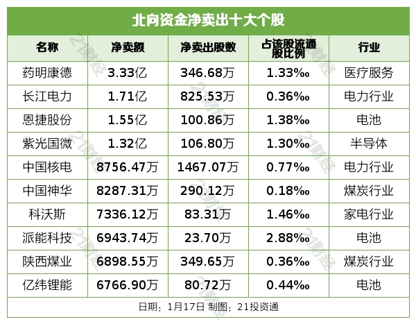 北向资金净卖出药明康德(603259.SH)、长江电力(600900.SH)、恩捷股份(002812.SZ)、紫光国微(002049.SZ)、中国核电(601985.SH)居前,其中,药明康德被净卖出3.33亿元,长江电力被净卖出1.71亿元,恩捷股份被净卖出1.55亿元,紫光国微被净卖出1.32亿元,中国核电被净卖出8756.47万元。