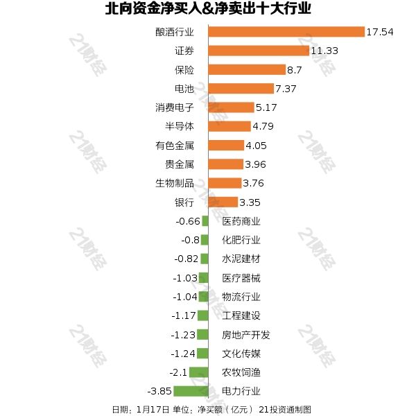 从净买入金额来看,北向资金增持了66个行业,其中酿酒行业居首,净买入金额达17.54亿元,其次是证券行业,净买入11.33亿元。