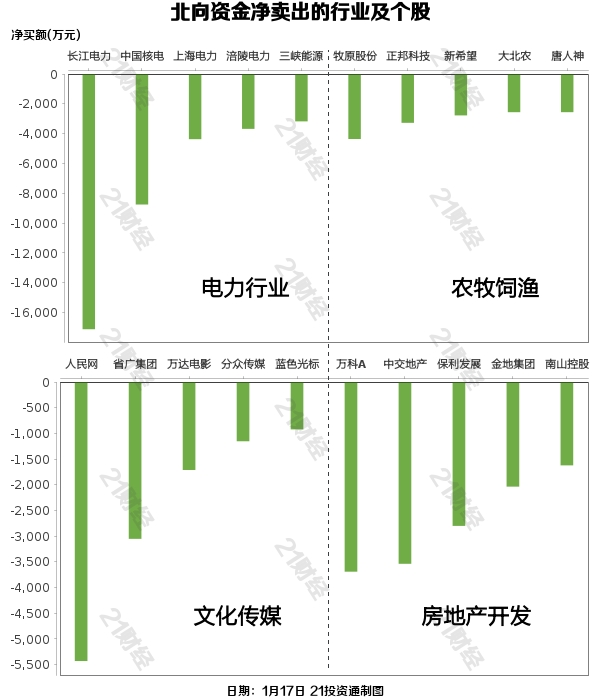 北向资金减持了34个行业,其中电力行业最多,净卖出金额达3.85亿元,其次是农牧饲渔行业,净卖出2.10亿元。