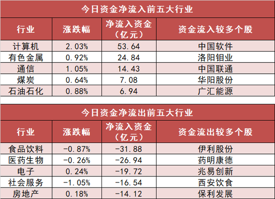 3、计算机行业净流入53.64亿元居首
