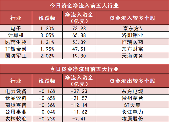 申万一级行业中,10个行业实现资金净流入,其中电子行业净流入73.93亿元居首。