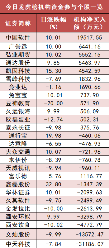盘后龙虎榜数据显示,机构现身26股,其中中国软件等12股呈现机构资金净买入,中天科技(维权)等14股呈现机构资金净卖出。
