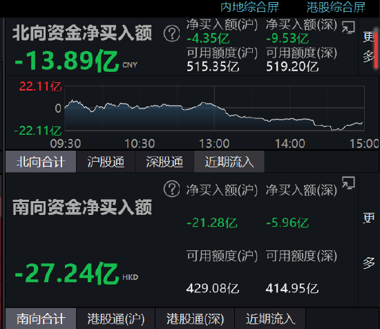 北向资金全天净卖出13.89亿元,近4日连续减仓累计超100亿元;其中沪股通净卖出4.35亿元,深股通净卖出9.53亿元。