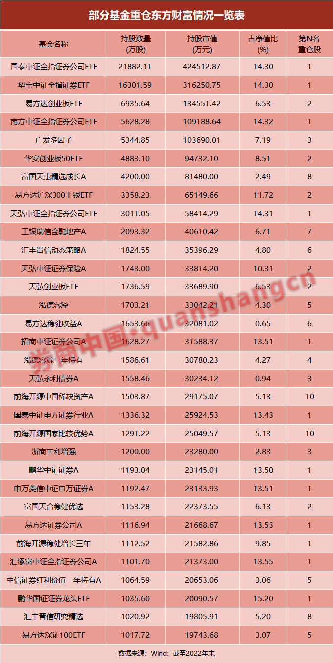 从单只基金看,持股数量前四名均为被动型指数基金,分别为国泰中证全指证券公司ETF(2.19亿股)、华宝中证全指证券ETF(1.63亿股)、易方达创业板ETF(6935.64万股)、南方中证全指证券公司ETF(5628.28万股);主动基金方面,广发多因子持有数量为5344.85万股,朱少醒管理的富国天惠精选成长持有4200万股。这些基金从东方财富年内上涨中,浮盈分别达5.15亿元、3.83亿元、1.63亿元、1.32亿元、1.26亿元、9870万元。