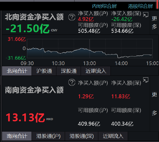 2月23日消息,北向资金全天净卖出21.5亿元,其中沪股通净买入4.92亿元,深股通净卖出26.42亿元,其中深股通连续3日净卖出。