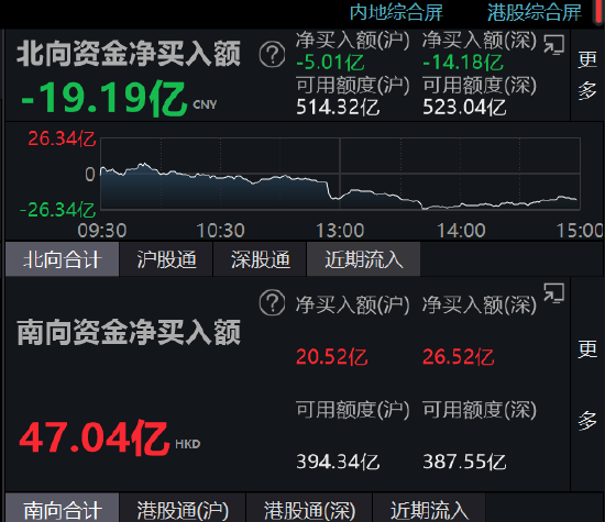 北向资金全天净卖出19.19亿元,其中沪股通净卖出5.01亿元,深股通净卖出14.18亿元。
