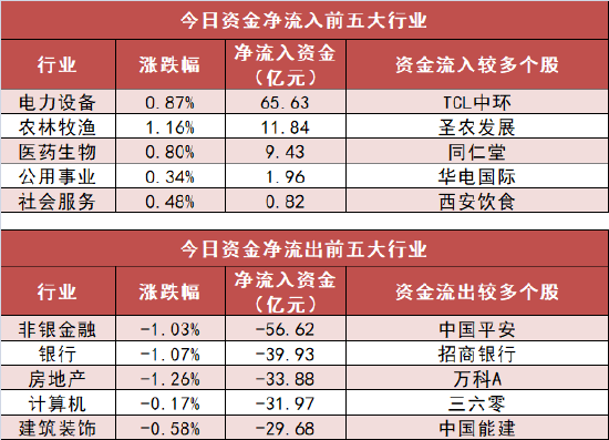 申万一级行业中,5个行业实现资金净流入,其中电力设备行业净流入65.63亿元居首。