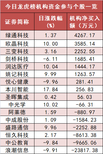 盘后龙虎榜数据显示,机构现身16股,其中绿通科技等9股现机构资金净买入,浪潮信息等7股呈现机构资金净卖出。