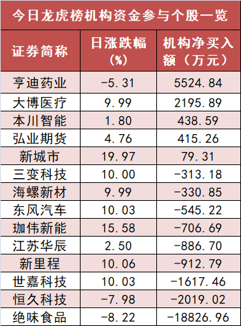 盘后龙虎榜数据显示,机构现身14股,其中亨迪药业等5股现机构资金净买入,绝味食品等9股呈现机构资金净卖出。