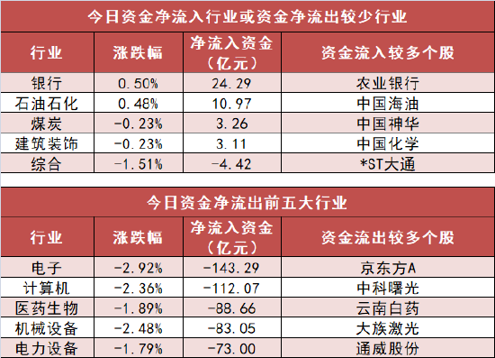 申万一级行业中,4个行业实现资金净流入,其中银行业净流入24.29亿元居首。