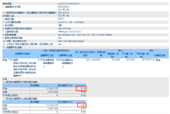 不过,仅仅一天过后,1月27日盘后另一份文件显示,中创新航在1月20日遭摩根大通以每股均价20.14港元减持1551.38万股H股,涉资3.12亿港元。减持后,摩根大通持有权益的股份数目为474.74万股,持股比例降至1.78%。