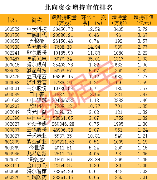 增持市值最多的是 中天科技(维权) ,北上资金最新持股量为3.05亿股,环比上一个交易日增加12.59%,增持市值为5.72亿元;其次是 宁德时代 、 五粮液 ,增持市值分别为3.67亿元、3.57亿元。