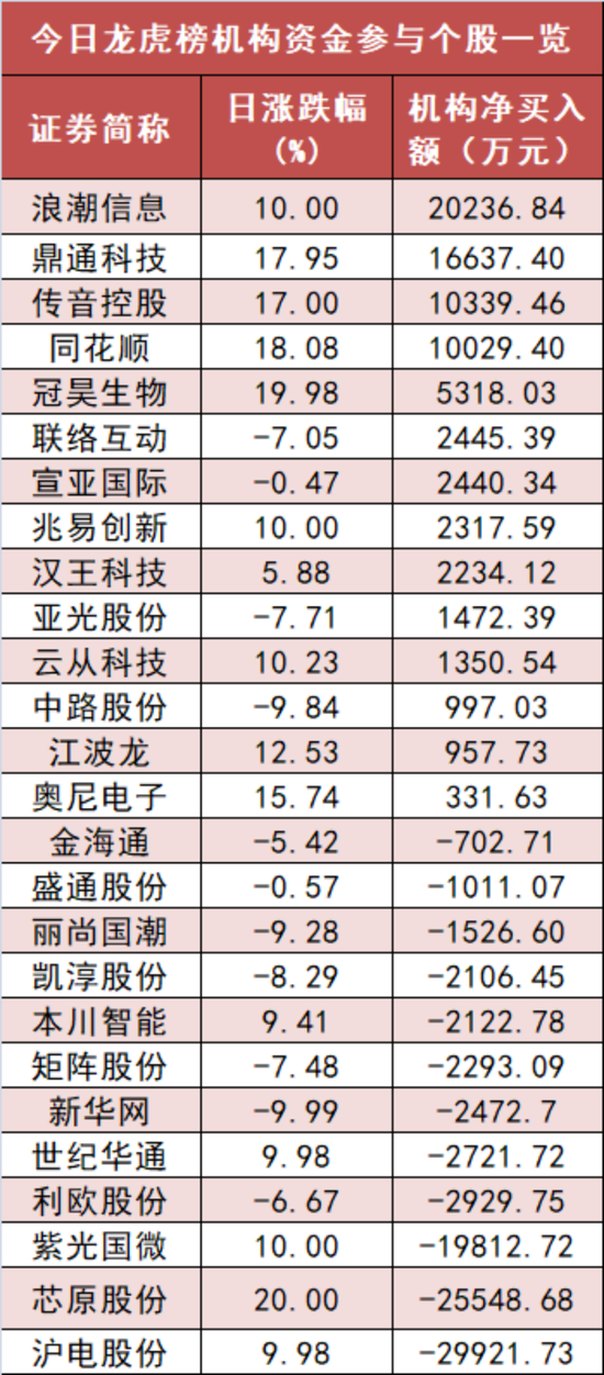 盘后龙虎榜数据显示,机构现身26股,其中浪潮信息等14股现机构资金净买入,沪电股份等12股呈现机构资金净卖出。