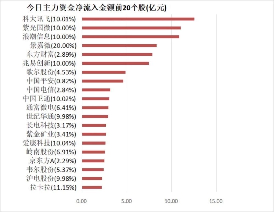 4、科大讯飞净流入12.54亿元居首
