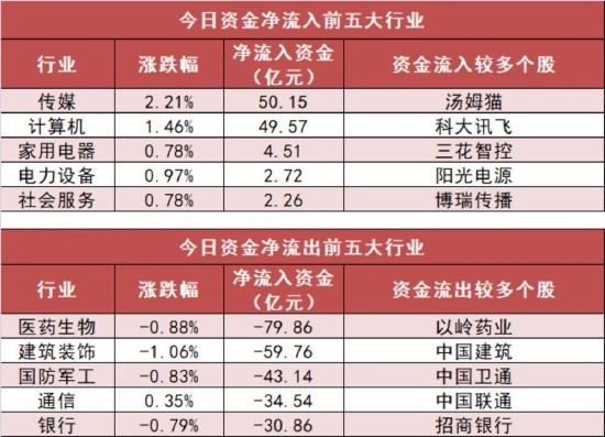 申万一级行业中,7个行业实现资金净流入,其中传媒行业净流入50.15亿元居首。