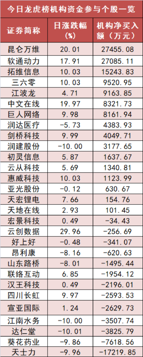 盘后龙虎榜数据显示,机构现身29股,其中昆仑万维等16股现机构资金净买入,天士力等13股呈现机构资金净卖出。