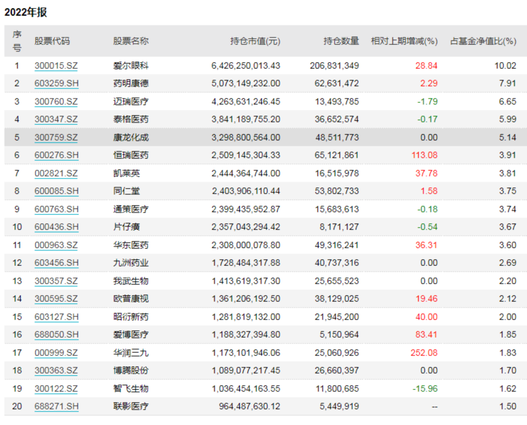 年报显示,该基金第11名至第20名隐形重仓股,主要有华东医药、九洲药业、我武生物、欧普康视、昭衍新药、爱博医疗、华润三九、博腾股份(维权)、智飞生物、联影医疗。