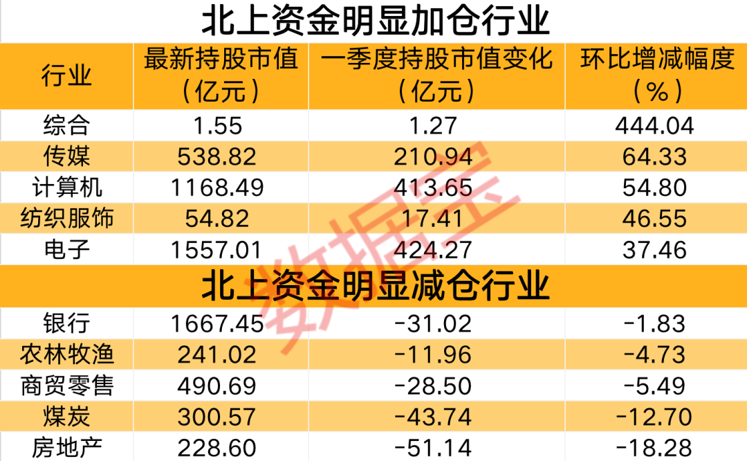 与去年末相比,综合、传媒、计算机、纺织服饰和电子行业北上资金一季度末持股市值显著增长,增幅均在30%以上,其中基数小的综合行业增幅最高,达到444.04%,传媒行业紧随其后,由去年末的327.88亿元增长到最新的538.82亿元,增幅达到64.33%。
