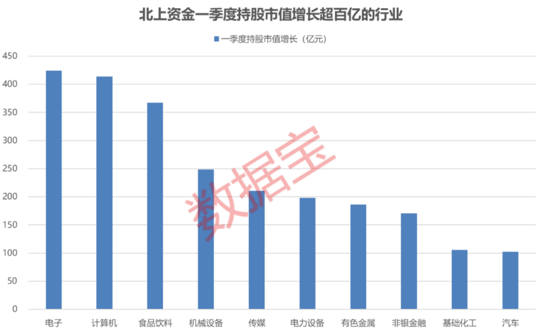 按持股市值变化来看,一季度10个行业北上资金持股市值增加百亿元以上,电子、计算机和食品饮料增长居前,分别为424.27亿元、413.65亿元、367.67亿元,其中电子行业持股市值超越家用电器,跻身北上资金重仓行业前五。房地产、煤炭、银行则为北上资金持股市值减少前三行业。