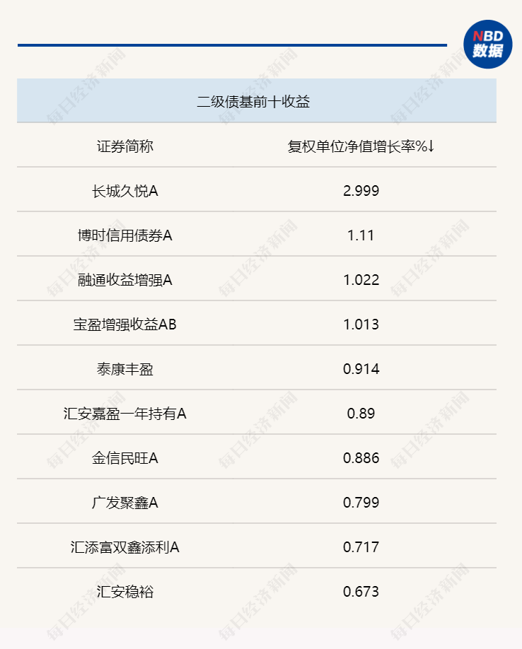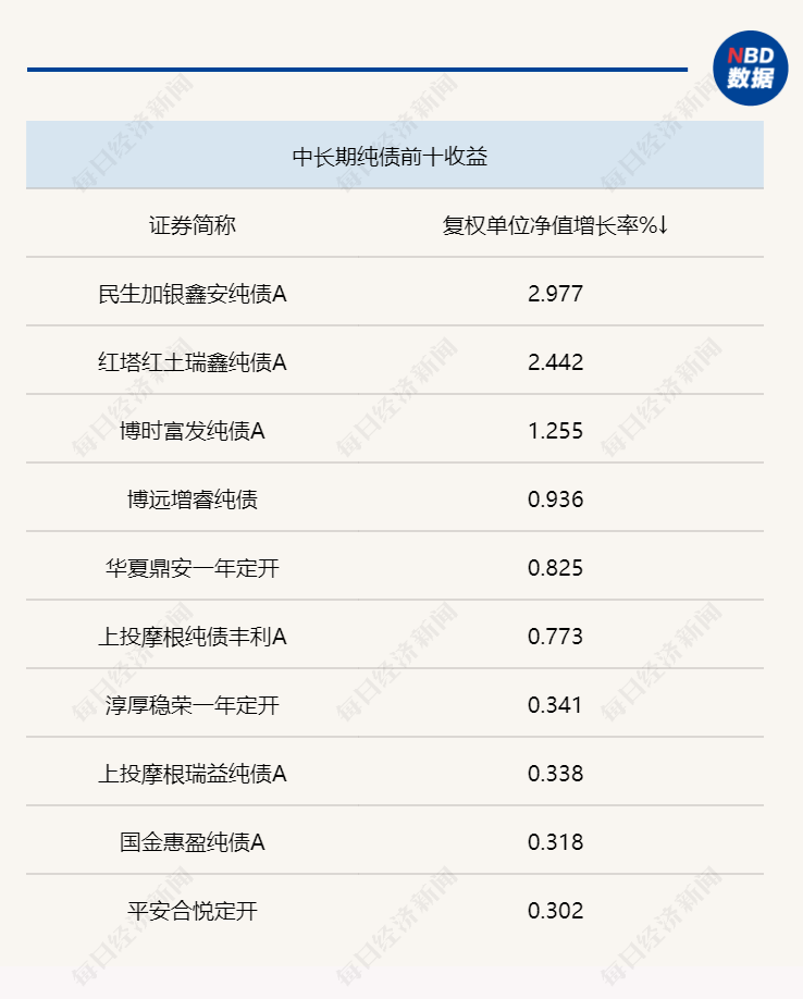 此外,上周的债券基金表现也相对较好,头部收益居高的基金当中,部分净值涨幅接近3%,如民生加银鑫安纯债A,上周净值增长2.9772%,长城久悦A同期涨2.9989%。