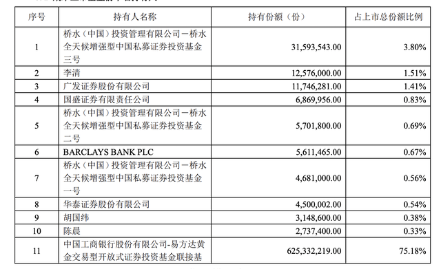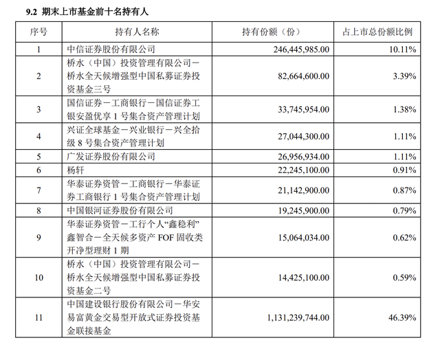 此外,桥水中国旗下的这三只私募基金在去年年底也持有易方达黄金ETF,分列第1、第5和第7大持有人,份额合计4197.63万份,期末持仓市值为1.66亿元。