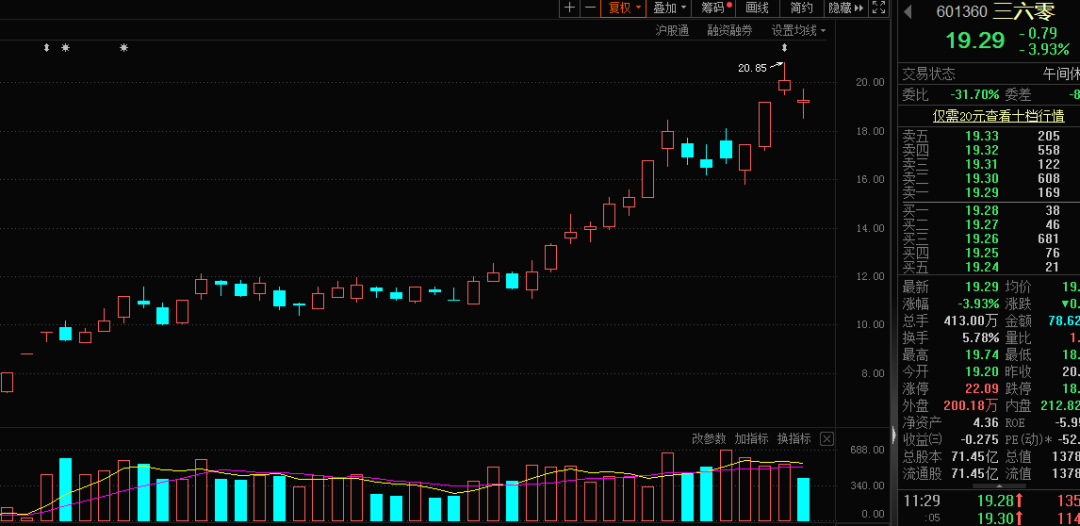 在此消息影响下,今天早盘三六零股价大幅低开,开盘跌4.38%,盘中最低跌至18.5元,跌幅近8%。截至上午收盘,该股报19.29元,下跌3.93%。值得注意的是,该股半日成交额高达78.6亿元,是贵州茅台今天上午成交额的近5倍,后者半日成交额17.1亿元。