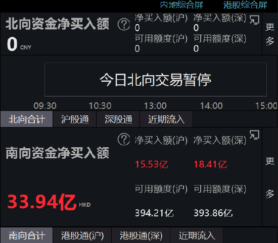 因复活节假期,北向交易暂停,南向资金净流入33.94亿元。具体来看,沪、深股通(北向)方面,4月5日(周三)至4月10日(周一)不提供沪、深股通服务服务,4月11日(周二)起照常开通沪、深股通服务;港股通(南向)方面,4月5日(周三)不提供港股通服务,4月6日(周四)照常开通港股通服务。4月7日(周五)至4月10日(周一)不提供港股通服务,4月11日(周二)起照常开通港股通服务。