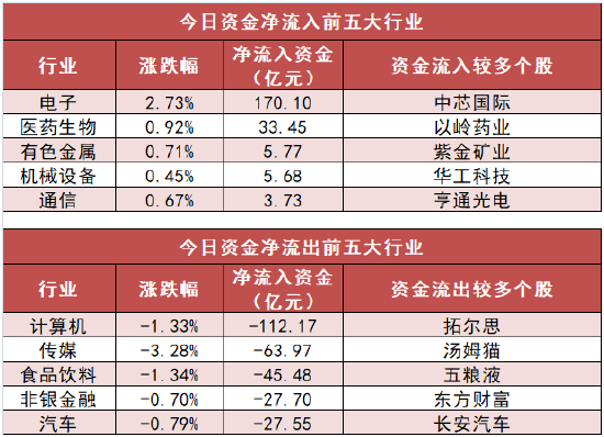 申万一级行业中,7个行业实现资金净流入,其中电子行业净流入170.1亿元居首。