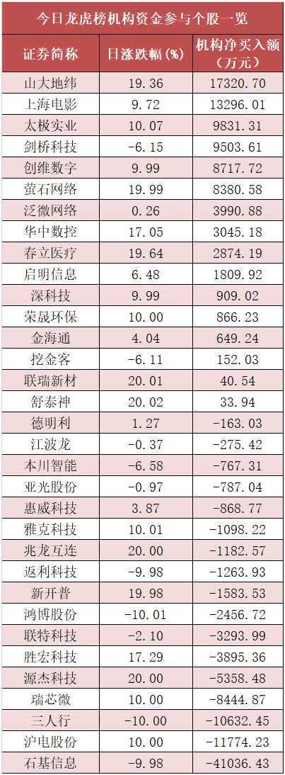盘后龙虎榜数据显示,机构现身33股,其中山大地纬等16股现机构资金净买入,石基信息等17股呈现机构资金净卖出。