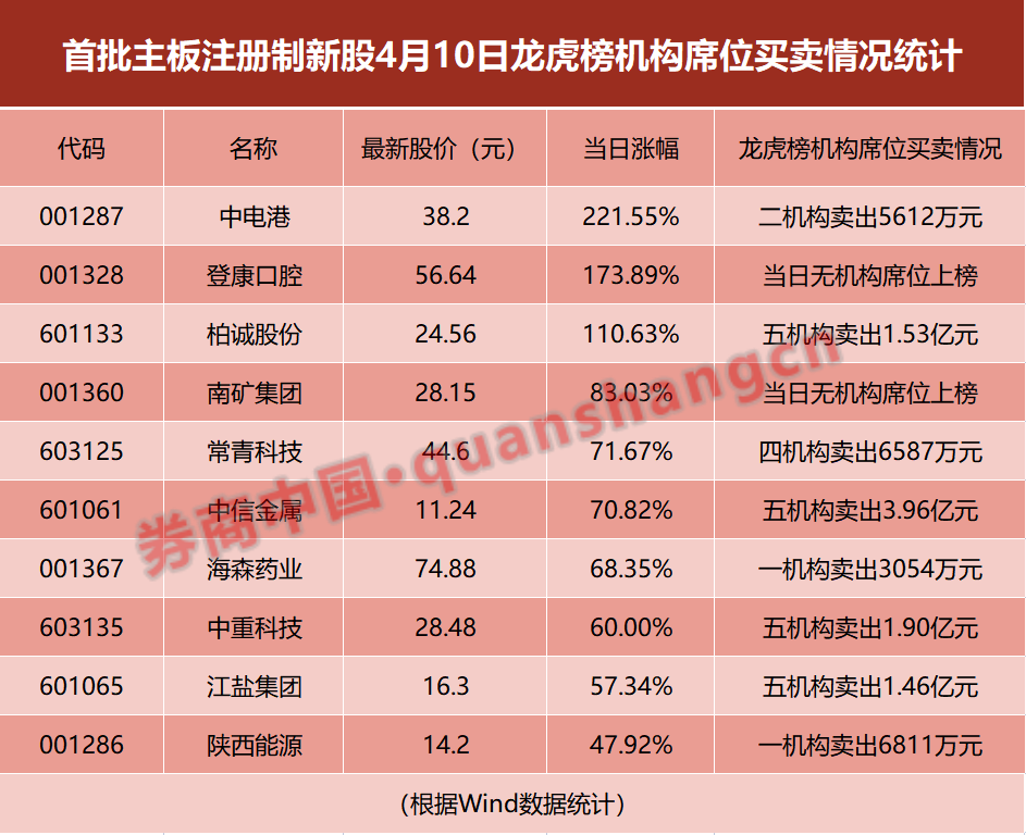 4月10日盘后,龙虎榜出炉,首批10只主板注册制新股上市首日全线大涨背后的资金也浮出水面。具体来看,机构资金清一色地“卖出”,8只新股被机构席位卖出,而在买入的席位中却无一机构席位上榜。