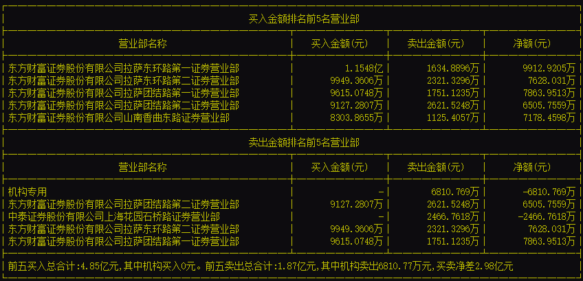 具体来看,陕西能源的买入前5营业部均为东方财富证券旗下的营业部,合计买入4.85亿元,合计卖出9454万元,净买入额为3.91亿元。