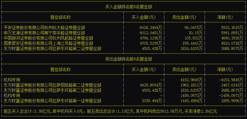 中信金属的买入前5营业部均为东方财富证券旗下的营业部,合计买入2.38亿元,卖出0元,净买入额为2.38亿元。