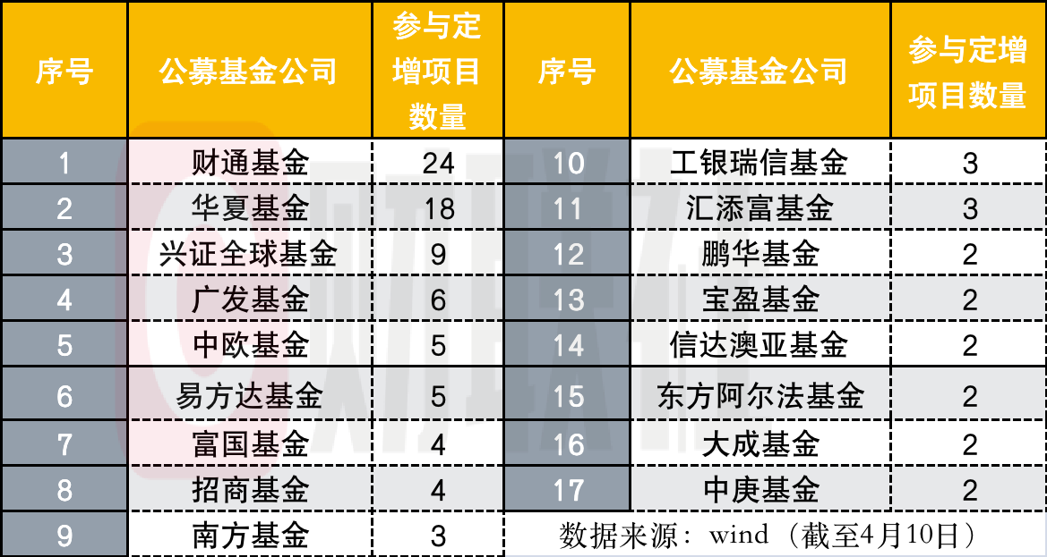 同一阶段,中欧基金、汇添富旗下分别有25只、24只参与定增项目,易方达和南方基金则各有22只产品参与了上市公司的定增发行。