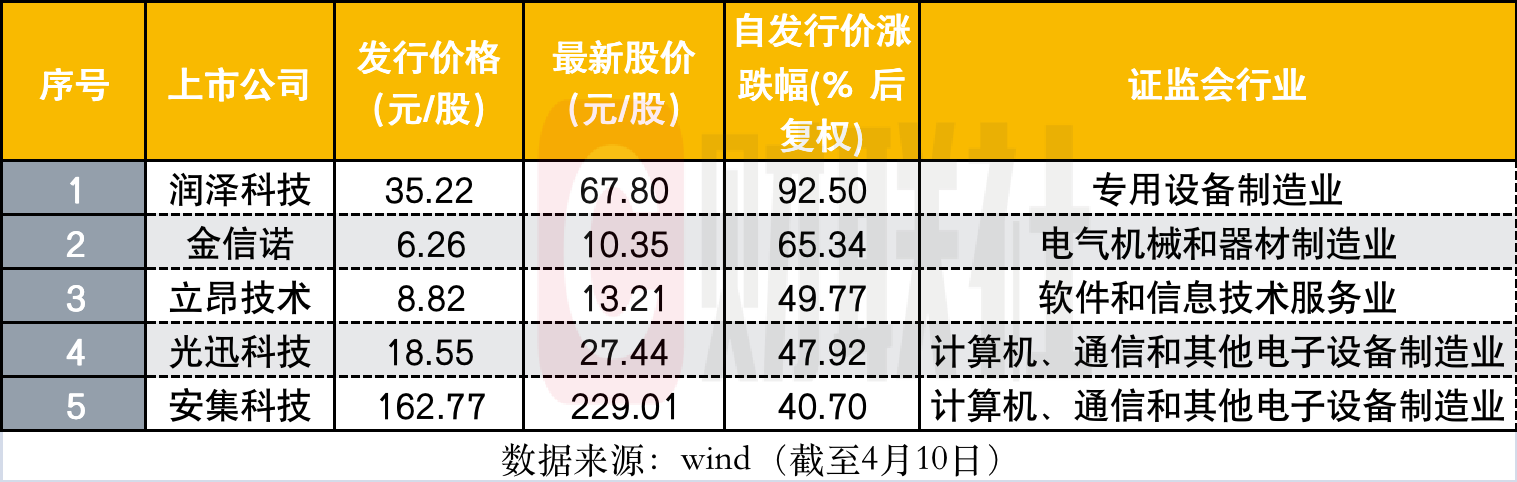 在公募基金参与定增浮盈的榜单上,排在润泽科技之后,是金信诺、立昂技术、光迅科技、安集科技等。以4月10日收盘价格计算,分别浮盈65.34%、49.77%、47.02%、40.7%。