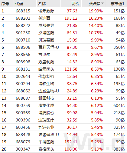 从涨幅居首的生物制药板块来看,诺禾致源、美迪西、成都先导、泓博医药、贝瑞基因等个股涨停或涨幅超10%,百利天恒-U、吉贝尔、方盛制药、皓元医药、佛慈制药、博雅生物、迈威生物-U、凯因科技、康龙化成、等个股亦大幅拉升。