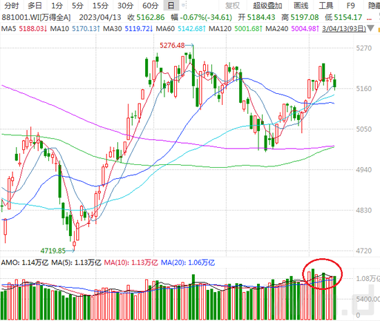 4月13日,万得全A小幅下跌0.67%,成交额为1.14万亿,连续8个交易日突破万亿。从技术图形上看,今日低开低走连续跌破5日和10日均线,且近期连续放量,指数冲高回落的走势,呈现出放量滞涨的态势,短期走势也面临更多不确定性。