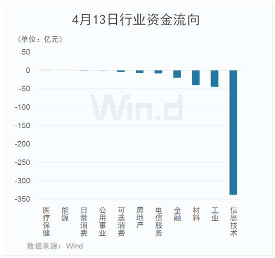 从4月13日行业资金流向来看,主力资金净流出400多亿元,多数行业净流出。其中,信息技术板块净流出额超300亿元,位居首位;工业、材料、金融等板块亦大幅净流出;医疗保健、能源板块则小幅净流入。