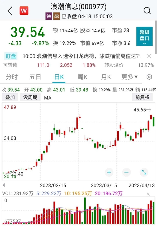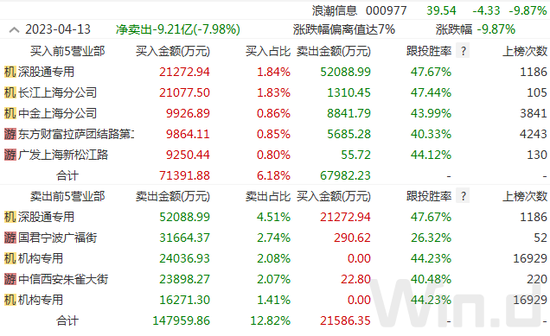4月13日,AI算力龙头浪潮信息大幅下跌9.87%,盘中一度跌停,全天成交额达115.44亿元。盘后龙虎榜数据显示,深股通席位净卖出逾3亿元,两机构卖出超4亿元。