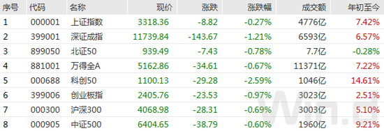 截至4月13日收盘,上证指数跌0.27%报收于3318.36点;深成指跌1.21%报收于11739.84点;创业板指跌0.97%报收于2405.76点,万得全A总成交1.14万亿。